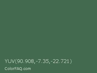 YUV 90.908,-7.35,-22.721 Color is a normal green color and the nearest color is Killarney #3a6a47. Hex code #416b4c and RGB value is rgb(65,107,76). In RGB color space, this color is composed of 25% red, 42% green, 30% blue, In CMYK color space, this color is composed of 39% cyan, 0% magenta, 29% yellow , 58% black , In HSL color space, this color has a hue angle of 136° , 24% saturation and 34% lightness.