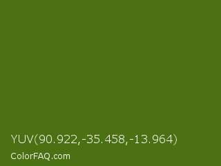 YUV 90.922,-35.458,-13.964 Color is a dark green color and the nearest color is Green Leaf #436a0d. Hex code #4b7113 and RGB value is rgb(75,113,19). In RGB color space, this color is composed of 29% red, 44% green, 7% blue, In CMYK color space, this color is composed of 34% cyan, 0% magenta, 83% yellow , 56% black , In HSL color space, this color has a hue angle of 84° , 71% saturation and 26% lightness.