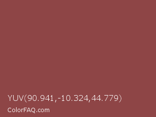 YUV 90.941,-10.324,44.779 Color is a normal red color and the nearest color is Copper Rust #944747. Hex code #8e4546 and RGB value is rgb(142,69,70). In RGB color space, this color is composed of 56% red, 27% green, 27% blue, In CMYK color space, this color is composed of 0% cyan, 51% magenta, 51% yellow , 44% black , In HSL color space, this color has a hue angle of 359° , 35% saturation and 41% lightness.