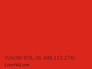 YUV 90.979,-31.049,112.274 Color is a normal red color and the nearest color is Maximum Red #d92121. Hex code #db261c and RGB value is rgb(219,38,28). In RGB color space, this color is composed of 86% red, 15% green, 11% blue, In CMYK color space, this color is composed of 0% cyan, 83% magenta, 87% yellow , 14% black , In HSL color space, this color has a hue angle of 3° , 77% saturation and 48% lightness.