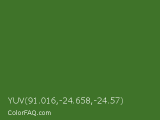 YUV 91.016,-24.658,-24.57 Color is a normal green color and the nearest color is Sap Green #507d2a. Hex code #3f7329 and RGB value is rgb(63,115,41). In RGB color space, this color is composed of 25% red, 45% green, 16% blue, In CMYK color space, this color is composed of 45% cyan, 0% magenta, 64% yellow , 55% black , In HSL color space, this color has a hue angle of 102° , 47% saturation and 31% lightness.