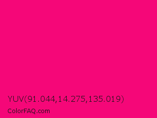 YUV 91.044,14.275,135.019 Color is a normal rose color and the nearest color is Winter Sky #ff007c. Hex code #f50778 and RGB value is rgb(245,7,120). In RGB color space, this color is composed of 96% red, 3% green, 47% blue, In CMYK color space, this color is composed of 0% cyan, 97% magenta, 51% yellow , 4% black , In HSL color space, this color has a hue angle of 332° , 94% saturation and 49% lightness.