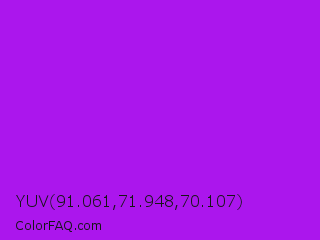 YUV 91.061,71.948,70.107 Color is a normal purple color and the nearest color is Veronica #a020f0. Hex code #ab16ed and RGB value is rgb(171,22,237). In RGB color space, this color is composed of 67% red, 9% green, 93% blue, In CMYK color space, this color is composed of 28% cyan, 91% magenta, 0% yellow , 7% black , In HSL color space, this color has a hue angle of 282° , 86% saturation and 51% lightness.
