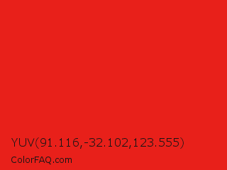 YUV 91.116,-32.102,123.555 Color is a normal red color and the nearest color is Lust #e62020. Hex code #e8201a and RGB value is rgb(232,32,26). In RGB color space, this color is composed of 91% red, 13% green, 10% blue, In CMYK color space, this color is composed of 0% cyan, 86% magenta, 89% yellow , 9% black , In HSL color space, this color has a hue angle of 2° , 82% saturation and 51% lightness.