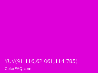 YUV 91.116,62.061,114.785 Color is a normal magenta color and the nearest color is Deep Magenta #cc00cc. Hex code #de00d9 and RGB value is rgb(222,-0,217). In RGB color space, this color is composed of 87% red, 0% green, 85% blue, In CMYK color space, this color is composed of 0% cyan, 100% magenta, 2% yellow , 13% black , In HSL color space, this color has a hue angle of 301° , 100% saturation and 44% lightness.