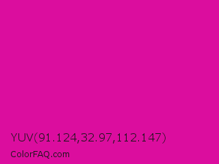 YUV 91.124,32.97,112.147 Color is a normal magenta color and the nearest color is Hollywood Cerise #f400a1. Hex code #db0d9e and RGB value is rgb(219,13,158). In RGB color space, this color is composed of 86% red, 5% green, 62% blue, In CMYK color space, this color is composed of 0% cyan, 94% magenta, 28% yellow , 14% black , In HSL color space, this color has a hue angle of 318° , 89% saturation and 45% lightness.
