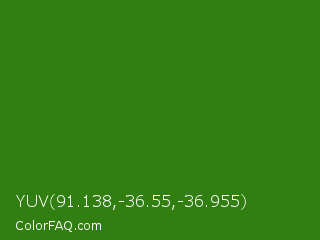 YUV 91.138,-36.55,-36.955 Color is a dark green color and the nearest color is Bilbao #327c14. Hex code #317f11 and RGB value is rgb(49,127,17). In RGB color space, this color is composed of 19% red, 50% green, 7% blue, In CMYK color space, this color is composed of 61% cyan, 0% magenta, 87% yellow , 50% black , In HSL color space, this color has a hue angle of 103° , 76% saturation and 28% lightness.