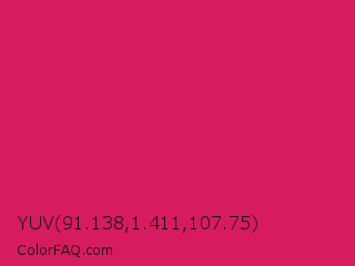 YUV 91.138,1.411,107.75 Color is a normal rose color and the nearest color is Dogwood Rose #d71868. Hex code #d61c5e and RGB value is rgb(214,28,94). In RGB color space, this color is composed of 84% red, 11% green, 37% blue, In CMYK color space, this color is composed of 0% cyan, 87% magenta, 56% yellow , 16% black , In HSL color space, this color has a hue angle of 339° , 77% saturation and 47% lightness.