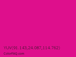 YUV 91.143,24.087,114.762 Color is a normal magenta color and the nearest color is Barbie Pink #e0218a. Hex code #de0f8c and RGB value is rgb(222,15,140). In RGB color space, this color is composed of 87% red, 6% green, 55% blue, In CMYK color space, this color is composed of 0% cyan, 93% magenta, 37% yellow , 13% black , In HSL color space, this color has a hue angle of 324° , 87% saturation and 46% lightness.