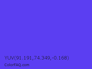 YUV 91.191,74.349,-0.168 Color is a normal indigo color and the nearest color is Majorelle Blue #6050dc. Hex code #5b3ef2 and RGB value is rgb(91,62,242). In RGB color space, this color is composed of 36% red, 24% green, 95% blue, In CMYK color space, this color is composed of 62% cyan, 74% magenta, 0% yellow , 5% black , In HSL color space, this color has a hue angle of 250° , 87% saturation and 60% lightness.
