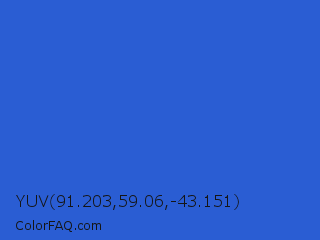YUV 91.203,59.06,-43.151 Color is a normal blue color and the nearest color is Mariner #286acd. Hex code #2a5dd3 and RGB value is rgb(42,93,211). In RGB color space, this color is composed of 16% red, 36% green, 83% blue, In CMYK color space, this color is composed of 80% cyan, 56% magenta, 0% yellow , 17% black , In HSL color space, this color has a hue angle of 222° , 67% saturation and 50% lightness.