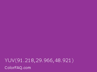 YUV 91.218,29.966,48.921 Color is a normal magenta color and the nearest color is Vivid Violet #803790. Hex code #933398 and RGB value is rgb(147,51,152). In RGB color space, this color is composed of 58% red, 20% green, 60% blue, In CMYK color space, this color is composed of 3% cyan, 66% magenta, 0% yellow , 40% black , In HSL color space, this color has a hue angle of 297° , 50% saturation and 40% lightness.