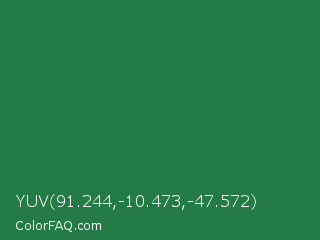 YUV 91.244,-10.473,-47.572 Color is a normal green color and the nearest color is Dark Spring Green #177245. Hex code #257b46 and RGB value is rgb(37,123,70). In RGB color space, this color is composed of 15% red, 48% green, 27% blue, In CMYK color space, this color is composed of 70% cyan, 0% magenta, 43% yellow , 52% black , In HSL color space, this color has a hue angle of 143° , 54% saturation and 31% lightness.