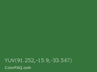 YUV 91.252,-15.9,-33.547 Color is a normal green color and the nearest color is Killarney #3a6a47. Hex code #35753b and RGB value is rgb(53,117,59). In RGB color space, this color is composed of 21% red, 46% green, 23% blue, In CMYK color space, this color is composed of 55% cyan, 0% magenta, 50% yellow , 54% black , In HSL color space, this color has a hue angle of 126° , 38% saturation and 33% lightness.