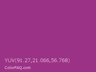 YUV 91.27,21.066,56.768 Color is a normal magenta color and the nearest color is Maximum Red Purple #a63a79. Hex code #9c3286 and RGB value is rgb(156,50,134). In RGB color space, this color is composed of 61% red, 20% green, 53% blue, In CMYK color space, this color is composed of 0% cyan, 68% magenta, 14% yellow , 39% black , In HSL color space, this color has a hue angle of 312° , 51% saturation and 40% lightness.