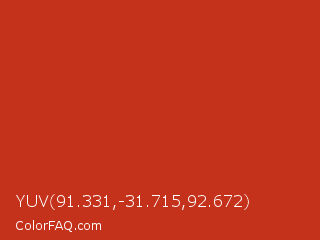 YUV 91.331,-31.715,92.672 Color is a normal red color and the nearest color is Thunderbird #c02b18. Hex code #c5321b and RGB value is rgb(197,50,27). In RGB color space, this color is composed of 77% red, 20% green, 11% blue, In CMYK color space, this color is composed of 0% cyan, 75% magenta, 86% yellow , 23% black , In HSL color space, this color has a hue angle of 8° , 76% saturation and 44% lightness.