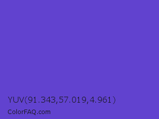 YUV 91.343,57.019,4.961 Color is a normal indigo color and the nearest color is Iris #5a4fcf. Hex code #6142cf and RGB value is rgb(97,66,207). In RGB color space, this color is composed of 38% red, 26% green, 81% blue, In CMYK color space, this color is composed of 53% cyan, 68% magenta, 0% yellow , 19% black , In HSL color space, this color has a hue angle of 253° , 59% saturation and 54% lightness.