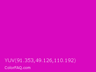 YUV 91.353,49.126,110.192 Color is a normal magenta color and the nearest color is Deep Magenta #cc00cc. Hex code #d908bf and RGB value is rgb(217,8,191). In RGB color space, this color is composed of 85% red, 3% green, 75% blue, In CMYK color space, this color is composed of 0% cyan, 96% magenta, 12% yellow , 15% black , In HSL color space, this color has a hue angle of 307° , 93% saturation and 44% lightness.