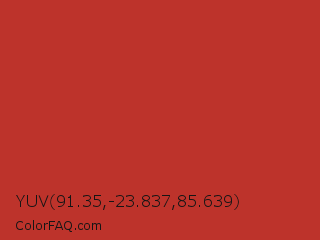 YUV 91.35,-23.837,85.639 Color is a normal red color and the nearest color is International Orange Golden Gate Bridge #c0362c. Hex code #bd332b and RGB value is rgb(189,51,43). In RGB color space, this color is composed of 74% red, 20% green, 17% blue, In CMYK color space, this color is composed of 0% cyan, 73% magenta, 77% yellow , 26% black , In HSL color space, this color has a hue angle of 3° , 63% saturation and 45% lightness.