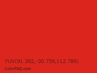 YUV 91.392,-30.759,112.789 Color is a normal red color and the nearest color is Maximum Red #d92121. Hex code #dc261d and RGB value is rgb(220,38,29). In RGB color space, this color is composed of 86% red, 15% green, 11% blue, In CMYK color space, this color is composed of 0% cyan, 83% magenta, 87% yellow , 14% black , In HSL color space, this color has a hue angle of 3° , 77% saturation and 49% lightness.