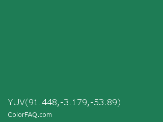 YUV 91.448,-3.179,-53.89 Color is a dark green color and the nearest color is Eucalyptus #278a5b. Hex code #1e7c55 and RGB value is rgb(30,124,85). In RGB color space, this color is composed of 12% red, 49% green, 33% blue, In CMYK color space, this color is composed of 76% cyan, 0% magenta, 31% yellow , 51% black , In HSL color space, this color has a hue angle of 155° , 61% saturation and 30% lightness.