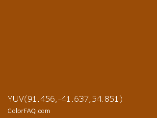 YUV 91.456,-41.637,54.851 Color is a normal orange color and the nearest color is Oregon #9b4703. Hex code #9a4c07 and RGB value is rgb(154,76,7). In RGB color space, this color is composed of 60% red, 30% green, 3% blue, In CMYK color space, this color is composed of 0% cyan, 51% magenta, 95% yellow , 40% black , In HSL color space, this color has a hue angle of 28° , 91% saturation and 32% lightness.
