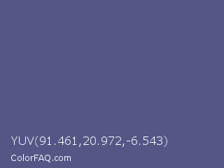 YUV 91.461,20.972,-6.543 Color is a normal blue color and the nearest color is Purple Navy #4e5180. Hex code #545786 and RGB value is rgb(84,87,134). In RGB color space, this color is composed of 33% red, 34% green, 53% blue, In CMYK color space, this color is composed of 37% cyan, 35% magenta, 0% yellow , 47% black , In HSL color space, this color has a hue angle of 236° , 23% saturation and 43% lightness.