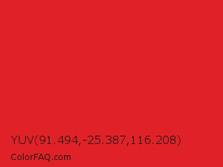 YUV 91.494,-25.387,116.208 Color is a normal red color and the nearest color is Maximum Red #d92121. Hex code #e02228 and RGB value is rgb(224,34,40). In RGB color space, this color is composed of 88% red, 13% green, 16% blue, In CMYK color space, this color is composed of 0% cyan, 85% magenta, 82% yellow , 12% black , In HSL color space, this color has a hue angle of 358° , 75% saturation and 51% lightness.