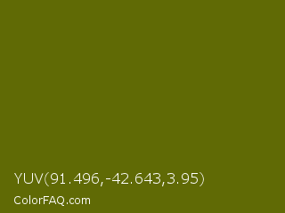 YUV 91.496,-42.643,3.95 Color is a very dark yellow color and the nearest color is Bronze Yellow #737000. Hex code #606a05 and RGB value is rgb(96,106,5). In RGB color space, this color is composed of 38% red, 42% green, 2% blue, In CMYK color space, this color is composed of 9% cyan, 0% magenta, 95% yellow , 58% black , In HSL color space, this color has a hue angle of 66° , 91% saturation and 22% lightness.
