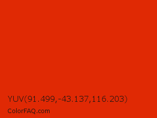 YUV 91.499,-43.137,116.203 Color is a normal red color and the nearest color is Lust #e62020. Hex code #e02904 and RGB value is rgb(224,41,4). In RGB color space, this color is composed of 88% red, 16% green, 2% blue, In CMYK color space, this color is composed of 0% cyan, 82% magenta, 98% yellow , 12% black , In HSL color space, this color has a hue angle of 10° , 96% saturation and 45% lightness.