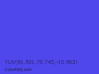 YUV 91.501,70.745,-10.963 Color is a normal indigo color and the nearest color is Majorelle Blue #6050dc. Hex code #4f46eb and RGB value is rgb(79,70,235). In RGB color space, this color is composed of 31% red, 27% green, 92% blue, In CMYK color space, this color is composed of 66% cyan, 70% magenta, 0% yellow , 8% black , In HSL color space, this color has a hue angle of 243° , 80% saturation and 60% lightness.