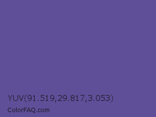 YUV 91.519,29.817,3.053 Color is a normal indigo color and the nearest color is Butterfly Bush #624e9a. Hex code #5f4e98 and RGB value is rgb(95,78,152). In RGB color space, this color is composed of 37% red, 31% green, 60% blue, In CMYK color space, this color is composed of 38% cyan, 49% magenta, 0% yellow , 40% black , In HSL color space, this color has a hue angle of 254° , 32% saturation and 45% lightness.