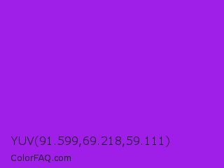 YUV 91.599,69.218,59.111 Color is a normal purple color and the nearest color is Veronica #a020f0. Hex code #9f1ee8 and RGB value is rgb(159,30,232). In RGB color space, this color is composed of 62% red, 12% green, 91% blue, In CMYK color space, this color is composed of 31% cyan, 87% magenta, 0% yellow , 9% black , In HSL color space, this color has a hue angle of 278° , 81% saturation and 51% lightness.