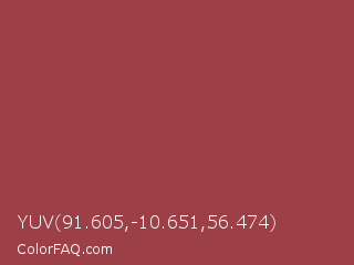 YUV 91.605,-10.651,56.474 Color is a normal red color and the nearest color is Smoky Topaz #933d41. Hex code #9c3f46 and RGB value is rgb(156,63,70). In RGB color space, this color is composed of 61% red, 25% green, 27% blue, In CMYK color space, this color is composed of 0% cyan, 60% magenta, 55% yellow , 39% black , In HSL color space, this color has a hue angle of 355° , 42% saturation and 43% lightness.