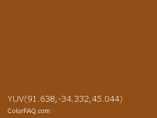 YUV 91.638,-34.332,45.044 Color is a normal orange color and the nearest color is Rope #8e4d1e. Hex code #8f4f16 and RGB value is rgb(143,79,22). In RGB color space, this color is composed of 56% red, 31% green, 9% blue, In CMYK color space, this color is composed of 0% cyan, 45% magenta, 85% yellow , 44% black , In HSL color space, this color has a hue angle of 28° , 73% saturation and 32% lightness.