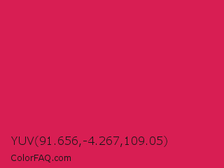 YUV 91.656,-4.267,109.05 Color is a normal rose color and the nearest color is Spanish Crimson #e51a4c. Hex code #d81e53 and RGB value is rgb(216,30,83). In RGB color space, this color is composed of 85% red, 12% green, 33% blue, In CMYK color space, this color is composed of 0% cyan, 86% magenta, 62% yellow , 15% black , In HSL color space, this color has a hue angle of 343° , 76% saturation and 48% lightness.