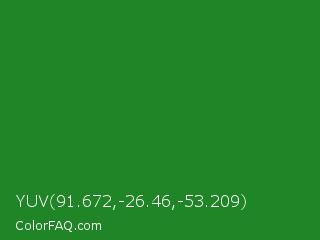 YUV 91.672,-26.46,-53.209 Color is a normal green color and the nearest color is Forest Green #228b22. Hex code #1f8526 and RGB value is rgb(31,133,38). In RGB color space, this color is composed of 12% red, 52% green, 15% blue, In CMYK color space, this color is composed of 77% cyan, 0% magenta, 71% yellow , 48% black , In HSL color space, this color has a hue angle of 124° , 62% saturation and 32% lightness.