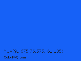 YUV 91.675,76.575,-61.105 Color is a normal blue color and the nearest color is Blue Crayola #1f75fe. Hex code #1661f7 and RGB value is rgb(22,97,247). In RGB color space, this color is composed of 9% red, 38% green, 97% blue, In CMYK color space, this color is composed of 91% cyan, 61% magenta, 0% yellow , 3% black , In HSL color space, this color has a hue angle of 220° , 93% saturation and 53% lightness.