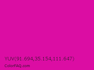 YUV 91.694,35.154,111.647 Color is a normal magenta color and the nearest color is Hollywood Cerise #f400a1. Hex code #db0da3 and RGB value is rgb(219,13,163). In RGB color space, this color is composed of 86% red, 5% green, 64% blue, In CMYK color space, this color is composed of 0% cyan, 94% magenta, 26% yellow , 14% black , In HSL color space, this color has a hue angle of 316° , 89% saturation and 45% lightness.