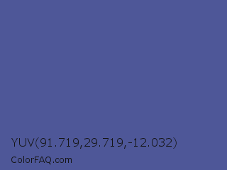 YUV 91.719,29.719,-12.032 Color is a normal blue color and the nearest color is Liberty #545aa7. Hex code #4e5798 and RGB value is rgb(78,87,152). In RGB color space, this color is composed of 31% red, 34% green, 60% blue, In CMYK color space, this color is composed of 49% cyan, 43% magenta, 0% yellow , 40% black , In HSL color space, this color has a hue angle of 233° , 32% saturation and 45% lightness.