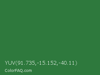 YUV 91.735,-15.152,-40.11 Color is a normal green color and the nearest color is Killarney #3a6a47. Hex code #2e793d and RGB value is rgb(46,121,61). In RGB color space, this color is composed of 18% red, 47% green, 24% blue, In CMYK color space, this color is composed of 62% cyan, 0% magenta, 50% yellow , 53% black , In HSL color space, this color has a hue angle of 132° , 45% saturation and 33% lightness.