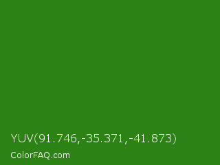 YUV 91.746,-35.371,-41.873 Color is a dark green color and the nearest color is Bilbao #327c14. Hex code #2c8214 and RGB value is rgb(44,130,20). In RGB color space, this color is composed of 17% red, 51% green, 8% blue, In CMYK color space, this color is composed of 66% cyan, 0% magenta, 85% yellow , 49% black , In HSL color space, this color has a hue angle of 107° , 73% saturation and 29% lightness.
