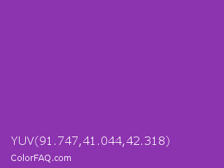 YUV 91.747,41.044,42.318 Color is a normal purple color and the nearest color is Grape #6f2da8. Hex code #8c33af and RGB value is rgb(140,51,175). In RGB color space, this color is composed of 55% red, 20% green, 69% blue, In CMYK color space, this color is composed of 20% cyan, 71% magenta, 0% yellow , 31% black , In HSL color space, this color has a hue angle of 283° , 55% saturation and 44% lightness.