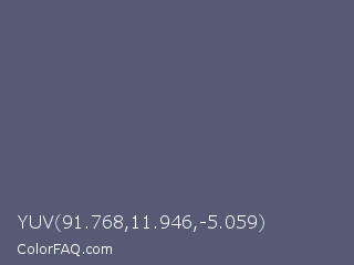 YUV 91.768,11.946,-5.059 Color is a normal blue color and the nearest color is Comet #5c5d75. Hex code #565a74 and RGB value is rgb(86,90,116). In RGB color space, this color is composed of 34% red, 35% green, 45% blue, In CMYK color space, this color is composed of 26% cyan, 22% magenta, 0% yellow , 55% black , In HSL color space, this color has a hue angle of 232° , 15% saturation and 40% lightness.