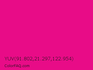YUV 91.802,21.297,122.954 Color is a normal magenta color and the nearest color is Mexican Pink #e4007c. Hex code #e80c87 and RGB value is rgb(232,12,135). In RGB color space, this color is composed of 91% red, 5% green, 53% blue, In CMYK color space, this color is composed of 0% cyan, 95% magenta, 42% yellow , 9% black , In HSL color space, this color has a hue angle of 326° , 90% saturation and 48% lightness.