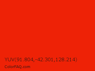 YUV 91.804,-42.301,128.214 Color is a normal red color and the nearest color is Scarlet #ff2400. Hex code #ee2206 and RGB value is rgb(238,34,6). In RGB color space, this color is composed of 93% red, 13% green, 2% blue, In CMYK color space, this color is composed of 0% cyan, 86% magenta, 97% yellow , 7% black , In HSL color space, this color has a hue angle of 7° , 95% saturation and 48% lightness.