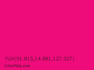 YUV 91.815,14.881,127.327 Color is a normal rose color and the nearest color is Red Purple #e40078. Hex code #ed0c7a and RGB value is rgb(237,12,122). In RGB color space, this color is composed of 93% red, 5% green, 48% blue, In CMYK color space, this color is composed of 0% cyan, 95% magenta, 49% yellow , 7% black , In HSL color space, this color has a hue angle of 331° , 90% saturation and 49% lightness.