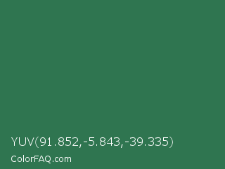 YUV 91.852,-5.843,-39.335 Color is a normal green color and the nearest color is Amazon #3b7a57. Hex code #2f7550 and RGB value is rgb(47,117,80). In RGB color space, this color is composed of 18% red, 46% green, 31% blue, In CMYK color space, this color is composed of 60% cyan, 0% magenta, 32% yellow , 54% black , In HSL color space, this color has a hue angle of 148° , 43% saturation and 32% lightness.