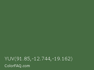 YUV 91.85,-12.744,-19.162 Color is a normal green color and the nearest color is Axolotl #4e6649. Hex code #466c42 and RGB value is rgb(70,108,66). In RGB color space, this color is composed of 27% red, 42% green, 26% blue, In CMYK color space, this color is composed of 35% cyan, 0% magenta, 39% yellow , 58% black , In HSL color space, this color has a hue angle of 114° , 24% saturation and 34% lightness.