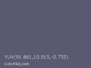 YUV 91.861,10.915,-0.755 Color is a normal indigo color and the nearest color is Comet #5c5d75. Hex code #5b5872 and RGB value is rgb(91,88,114). In RGB color space, this color is composed of 36% red, 35% green, 45% blue, In CMYK color space, this color is composed of 20% cyan, 23% magenta, 0% yellow , 55% black , In HSL color space, this color has a hue angle of 247° , 13% saturation and 40% lightness.
